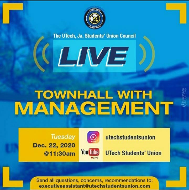 Publicity flyer for the live town hall meeting with the management of UTech Jamaica, hosted by the UTech Jamaica Students’ Union Council.