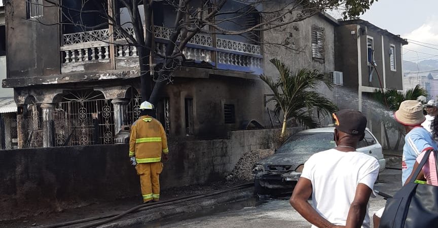 Firemen conduct cooling down operations at Kareen’s Restaurant, Cooreville Gardens where a explosion caused by a cooking gas delivery truck on Friday, March 5, 2021. Photo by Dannielle Mullings