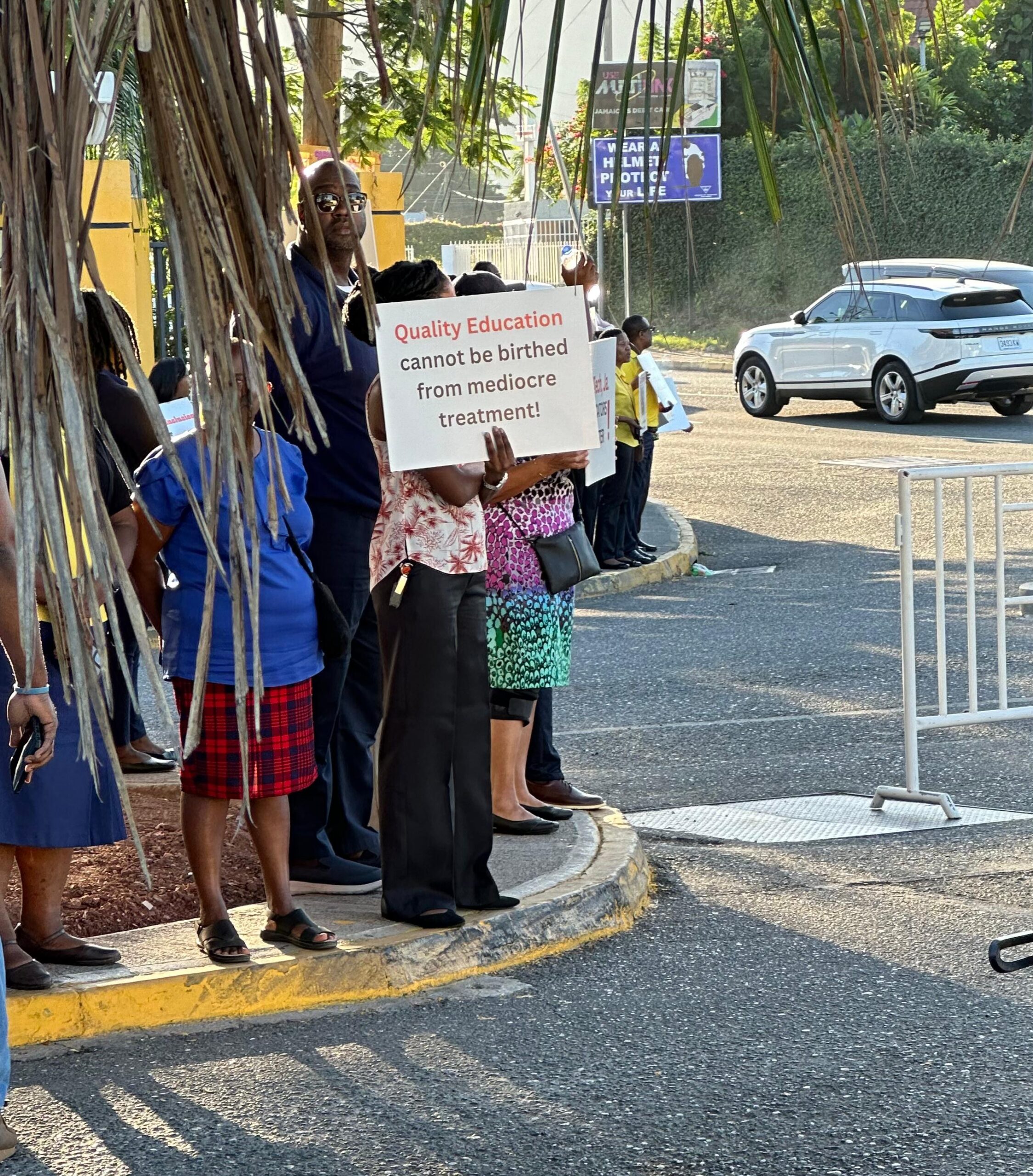 After gathering at the main gate, staff in Kingston proceeded to the Ministry of Education (MoE) and the Ministry of Finance and the Public Service (MoFPS) to continue their action.